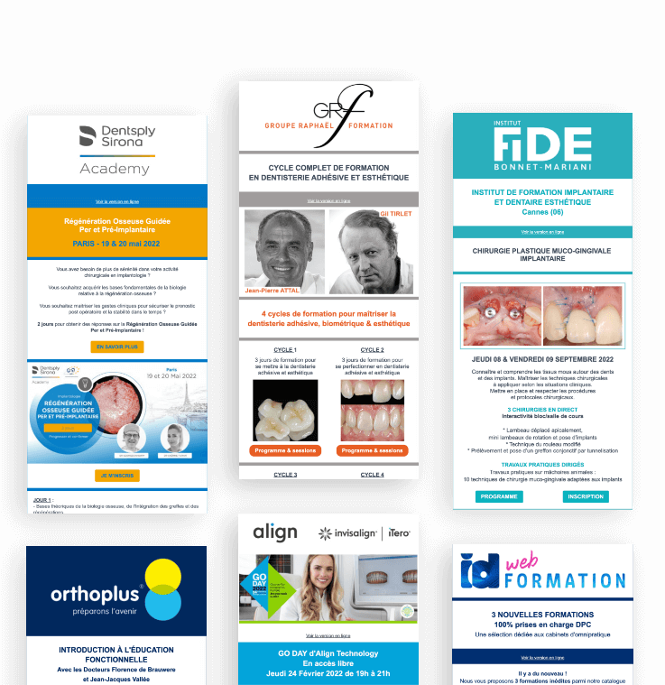 Chaque campagne emailing est intégralement dédiée à un seul annonceur et routée à l’intégralité de notre base de données qualifiée BtB de la filière dentaire.